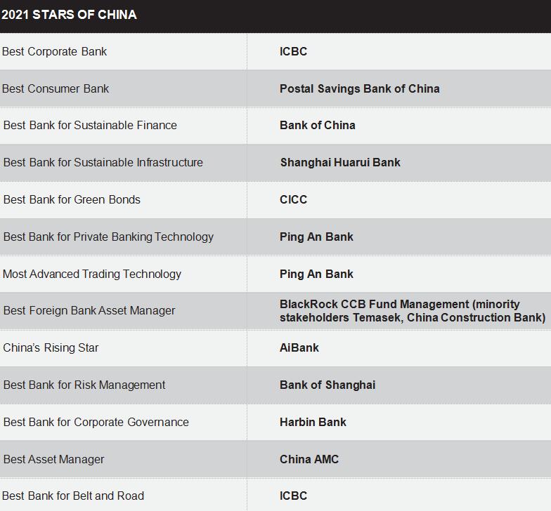 Global Finance, międzynarodowy magazyn finansowy, ogłosił niedawno zwycięzców 14 edycji dorocznych nagród Stars of China, honorujących najlepsze chińskie banki, firmy fintechowe i firmy zarządzające aktywami.