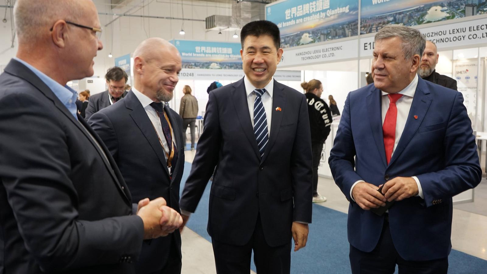 Uroczystość ceremonii otwarcia 14. edycji targów China Poland Trade Fair, od lewej: Marek Traczyk – Prezes Warszawskiej Izby Gospodarczej, Binu Pillaj – COO Meorient International Exhibition, Xu Xiaofeng – Minister-Radca Biuro Radcy Ekonomiczno-Handlowego Ambasady Chińskiej Republiki Ludowej w RP, Marek Cieśliński – dyrektor Departament Rolnictwa Ekologicznego i Jakości Żywności Ministerstwo Rolnictwa i rozwoju Wsi, Janusz Piechociński – Prezes Izba Przemysłowo – Handlowa Polska – Azja (b. wicepremier i minister gospodarki), Sun Linjiang – Ambasador Nadzwyczajny i Pełnomocny Chińskiej Republiki Ludowej w RP, Tomasz Szypuła – Prezes Ptak Warsaw Expo, Wang Deyang – zastępca dyrektora generalnego Biuro Rozwoju Handlu Ministerstwa Handlu ChRL, Mariusz Rukat – delegat Adama Struzika Marszałka Województwa Mazowieckiego, Chen Xunchao – zastępca dyrektora Biuro Rozwoju Handlu Ministerstwa Handlu ChRL, Wang Feishuo – kierownik Sekcji Gospodarki Zagranicznej i Handlu Biuro Handlu Okręgu Hangzhou Qiantang, Han Li – Kierownik Działu Operacji Inwestycyjnych Centrum Obsługi Inwestycyjnej Dystryktu Hangzhou Qiantang.